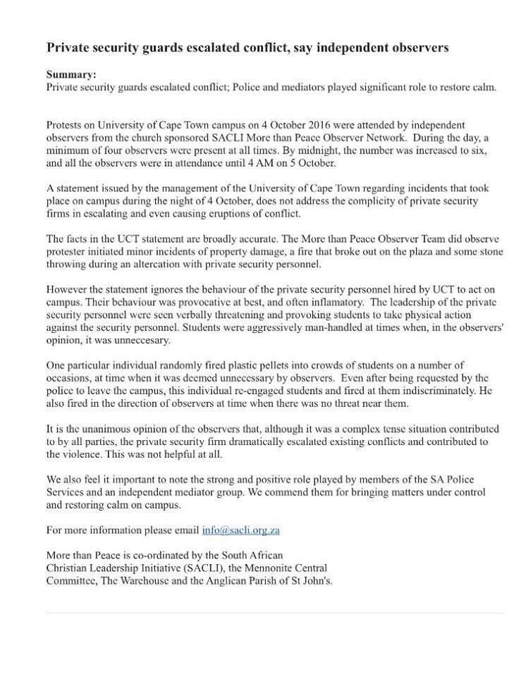 A witness interviewed by GroundUp said private security officers had been aggressive and triggered a response from students. She commended the police for helping to de-escalate the situation. Her testimony is corroborated by this account by an organisation called More Than Peace: