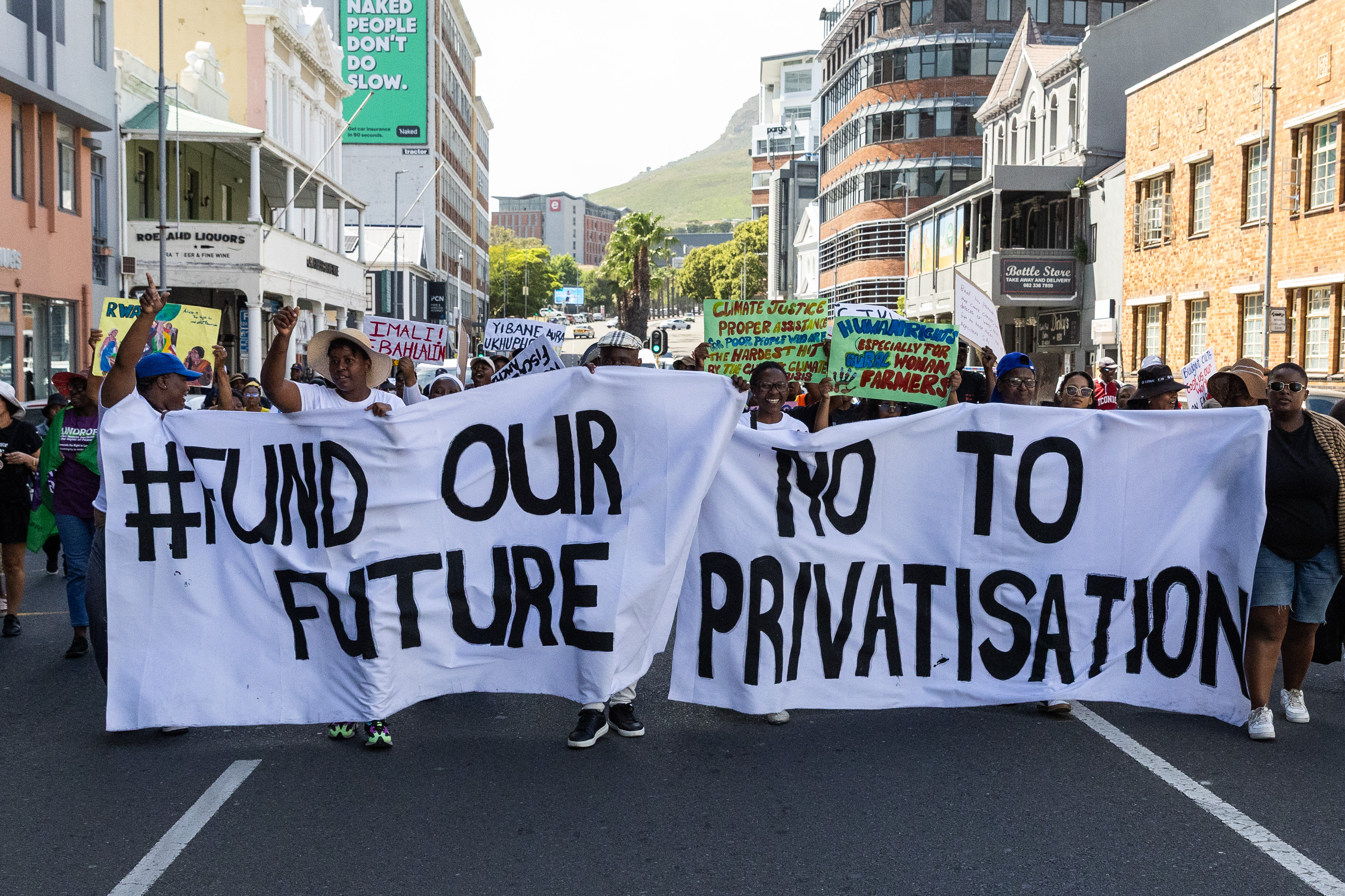 Several organisations under the banner People Against Budget Cuts gathered outside parliament on Wednesday ahead of the budget speech, calling for higher taxes on wealthy people and increased social spending. Photo: Ashraf Hendricks