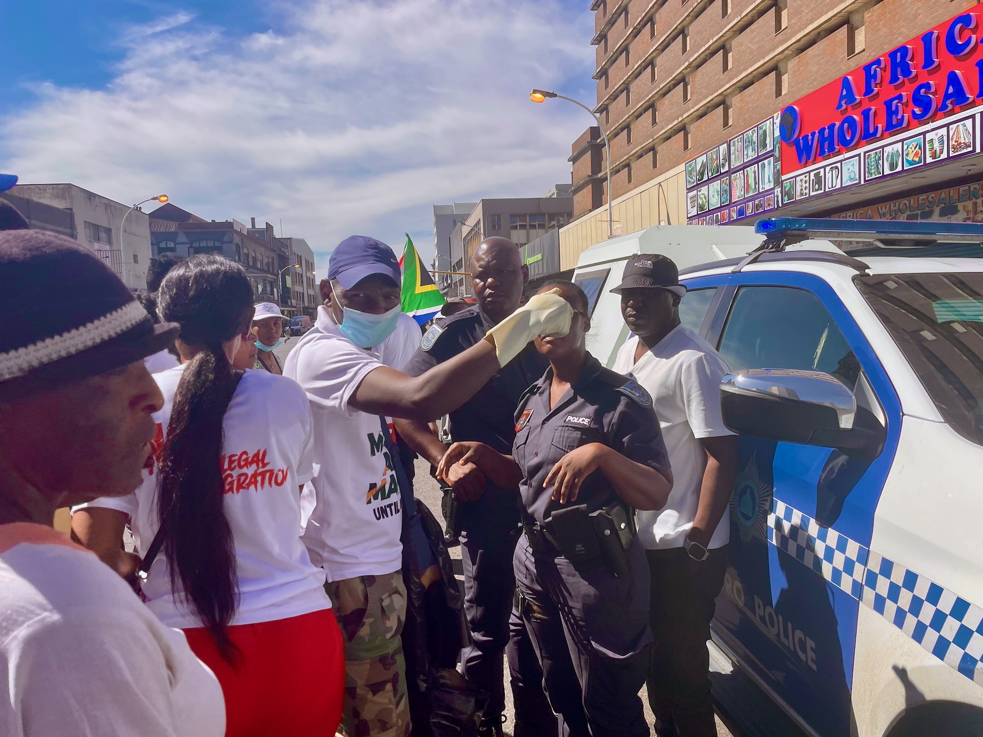 In one incident, a man suspected of being an illegal immigrant sheltered behind metro police. The officers told GroundUp it was their duty to protect him, but they would question him once the mob left.