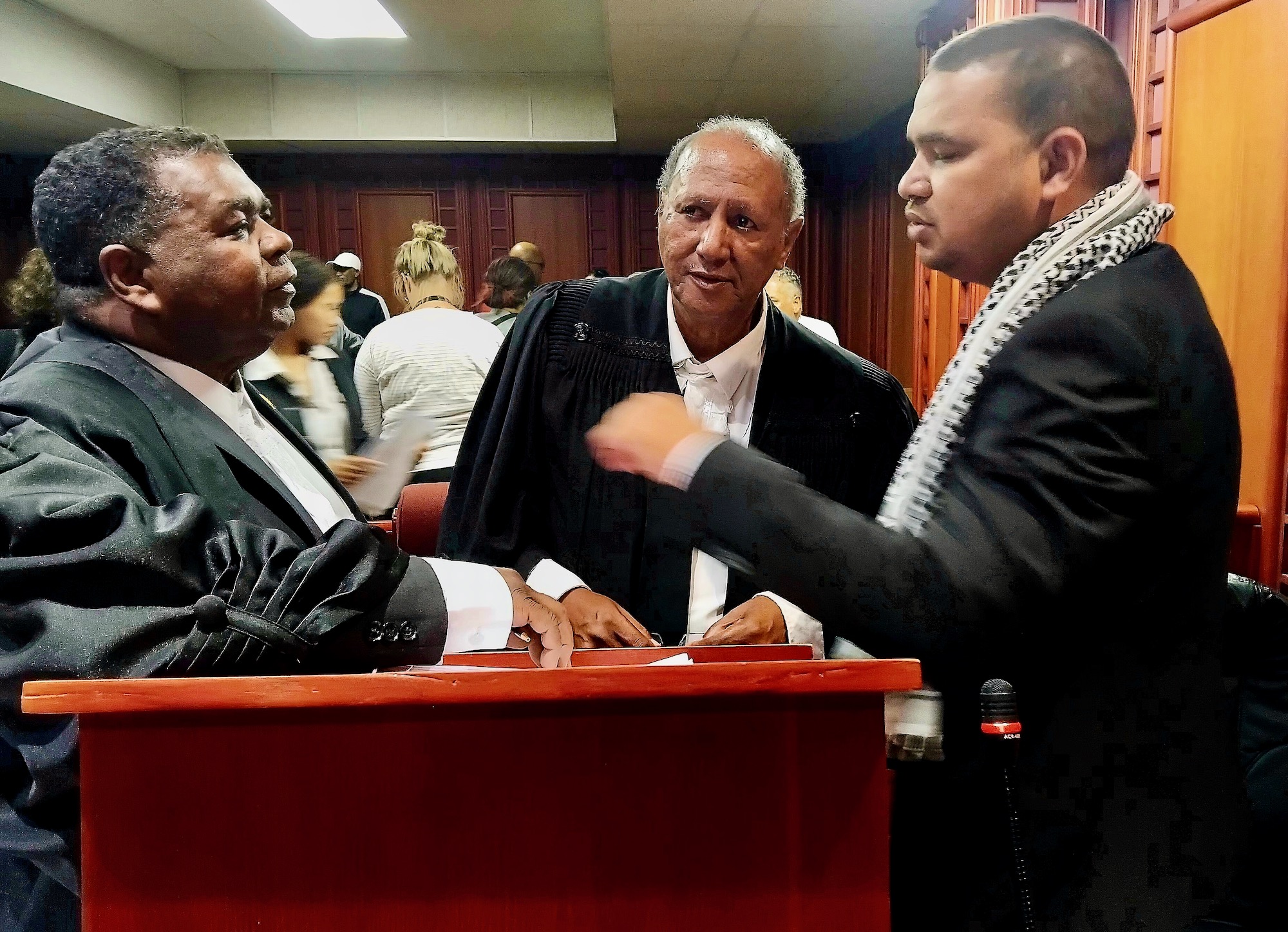 Wesley Neumann (right) with his legal representatives, advocate Rod Solomons (left) and advocate Vernon Seymour (centre), in the Labour Court in Cape Town on Friday. Neumann will not return to Heathfield High until the court rules on whether his reinstatement can proceed pending an appeal. Photo: Marecia Damons