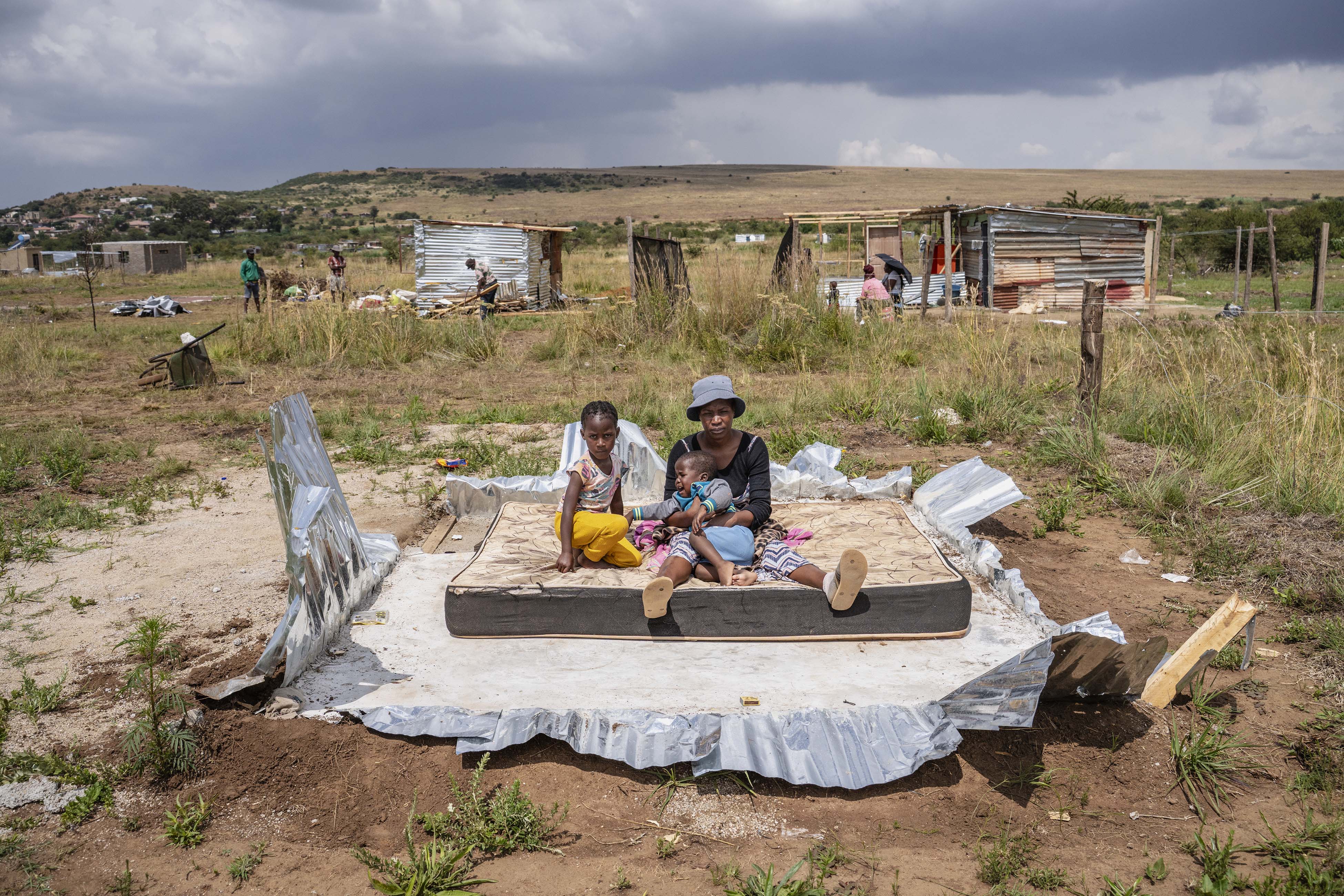 Masechaba Moloi with two of her children, Rorisang and Buti, sit on a mattress on the plot where their home was demolished on municipal land in Ennerdale Extension 7. Her building materials were confiscated by the Johannesburg Metropolitan Police Department on Monday. She had bought them on credit and still owes the money. Photos: Ihsaan Haffejee