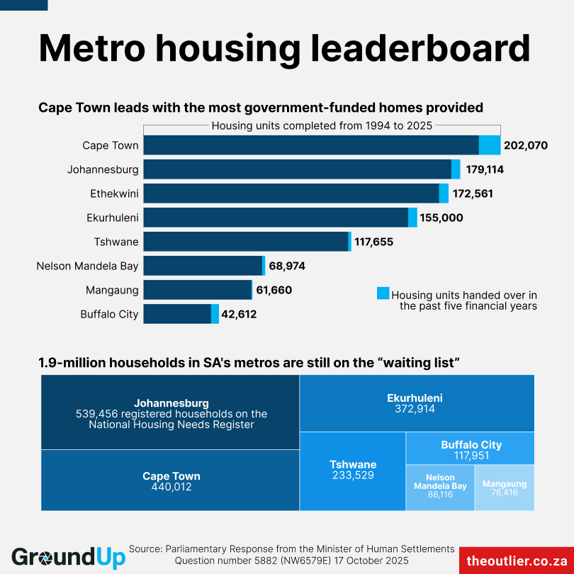 Simelane did not comment on the quality or type of homes provided (there are various government housing models), or whether the completed homes have been well-maintained and are still occupied. Information on where the homes are located was also not provided. While Cape Town leads in total houses completed, the city has unique challenges that limit access to well-located affordable housing