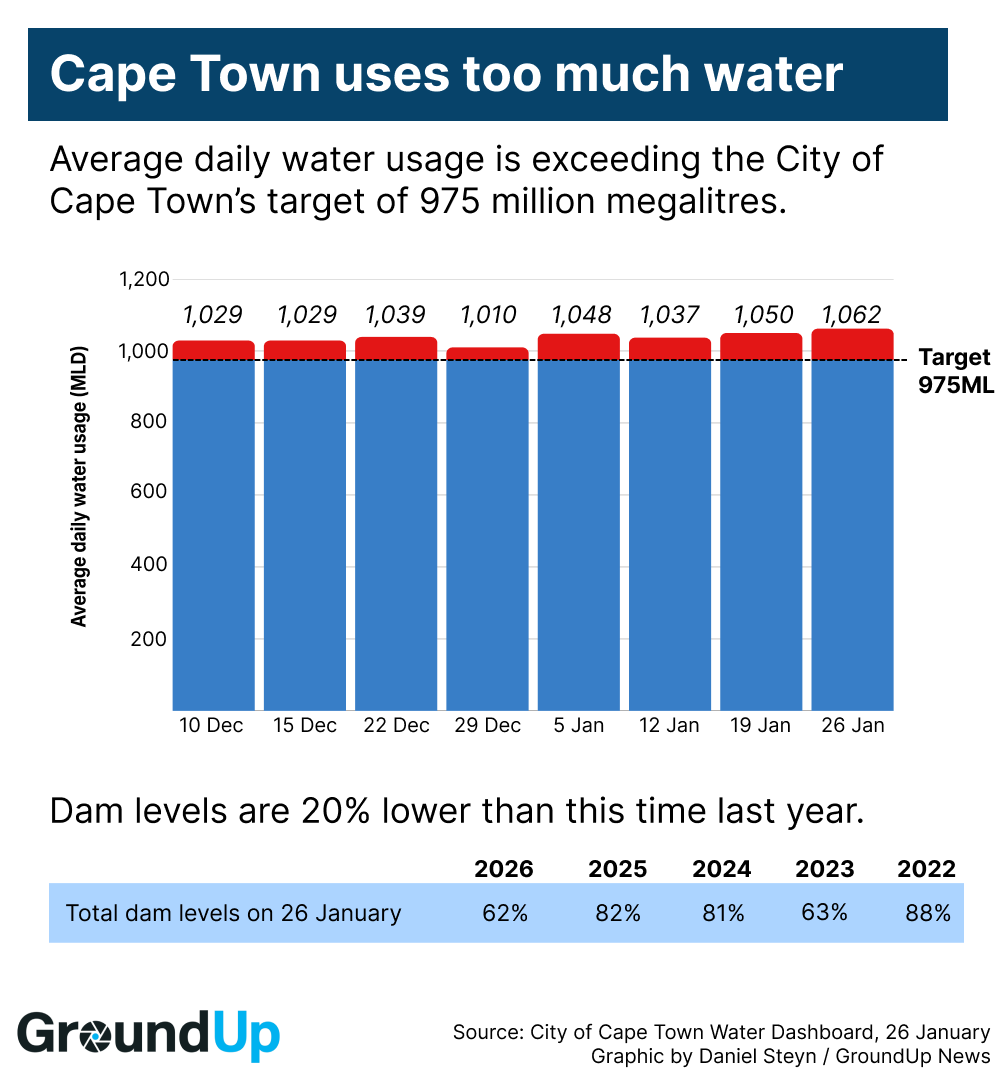 - Cape Town’s population is consuming about 1,056 million litres per day, exceeding the City’s summer target of less than 975 million litres.