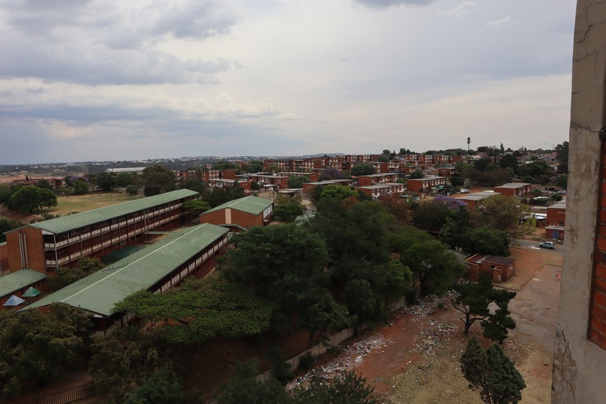 The suburb — an apartheid-era low-cost housing development — comprises several low, honey-brick tenements, built on a hillside that runs down to the Roodepoort to Johannesburg railway line and the Newclare shacklands.
