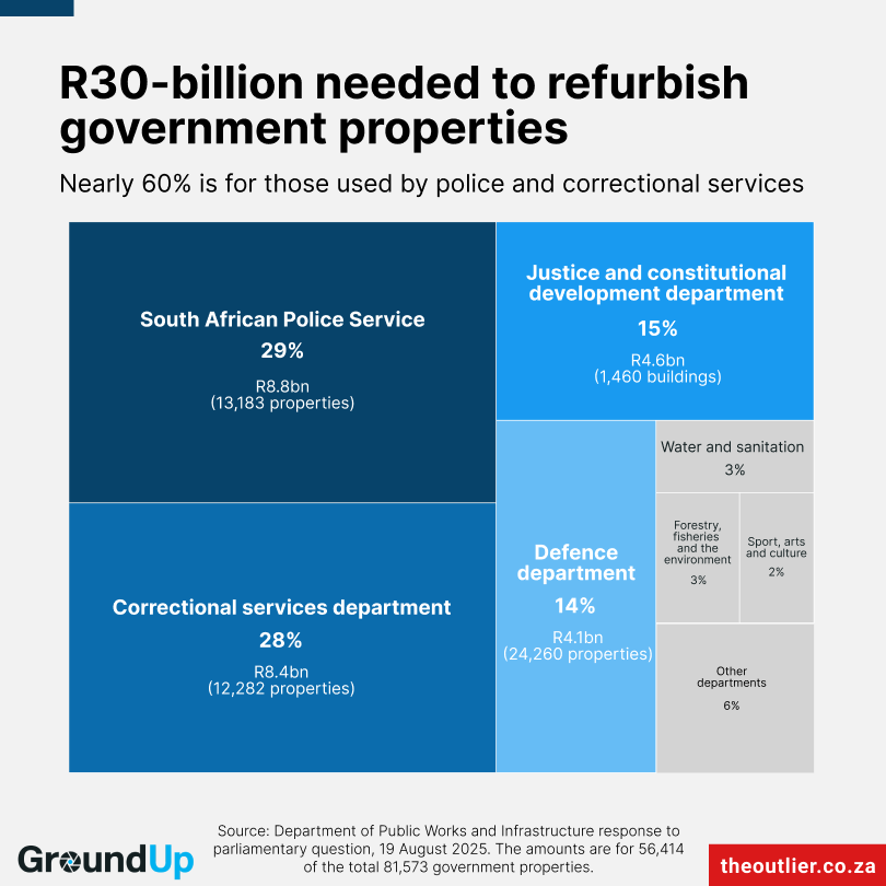 The government has about 81,000 properties in total, but only 56,000 have had assessments done to estimate maintenance costs. The current backlog will cost R30-billion — money the department doesn’t have. The longer it takes to clear the backlog, the more it will cost as buildings grow older and their conditions deteriorate.