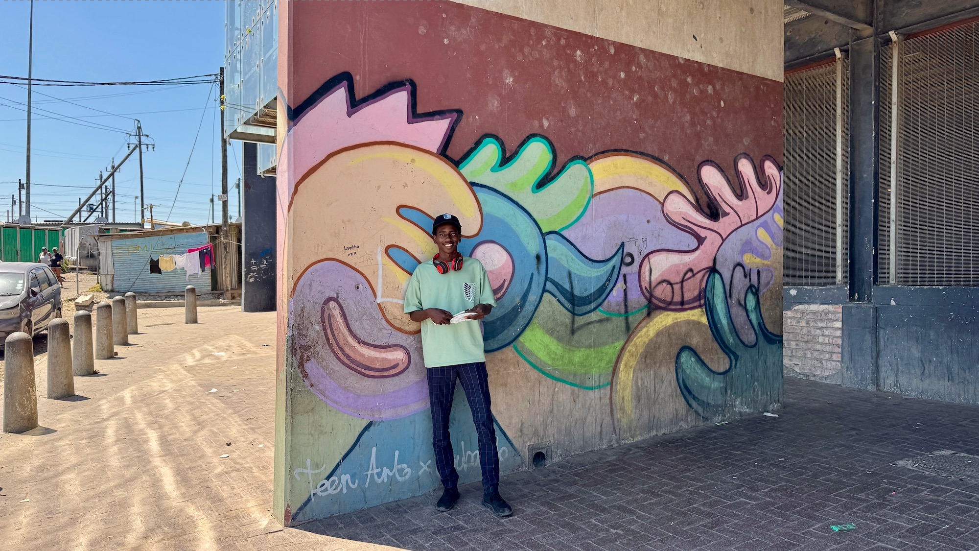 With paint and brushes sponsored by donors, Dunoon artist Sibusiso Dube helped transform the bare concrete pillars of the local library into a vivid display of doodle art – a tribute to the community that shaped him.