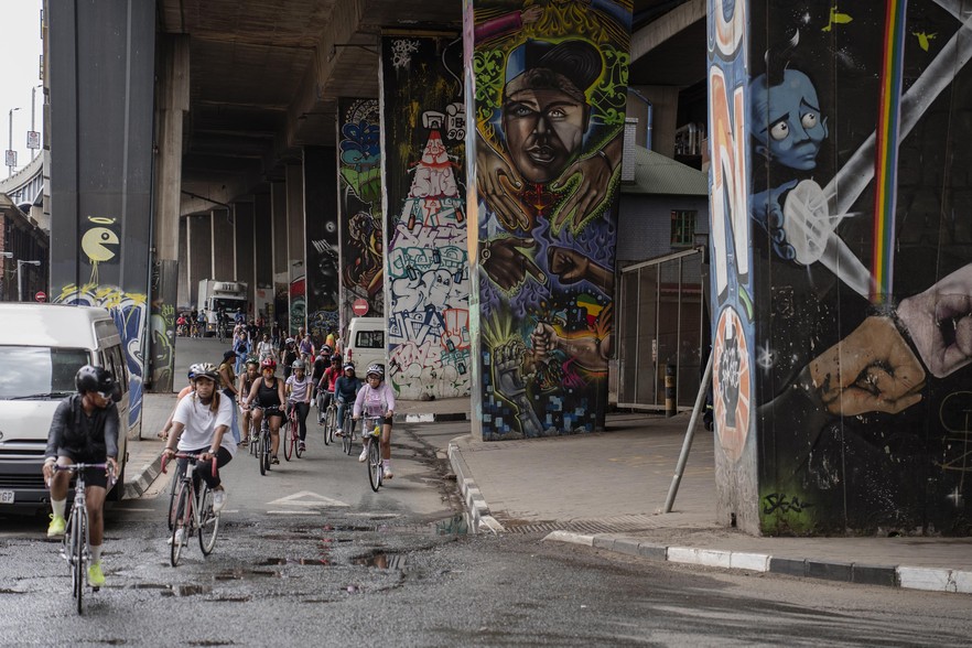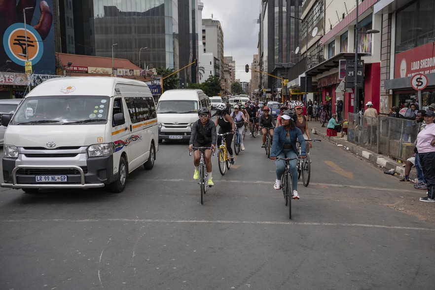 The cyclists make their way through Braamfontein, Newtown and into the city centre, where they receive some puzzled stares from onlookers but also some encouragement from shopkeepers, pedestrians and even hoots of approval and thumbs up from taxi drivers.