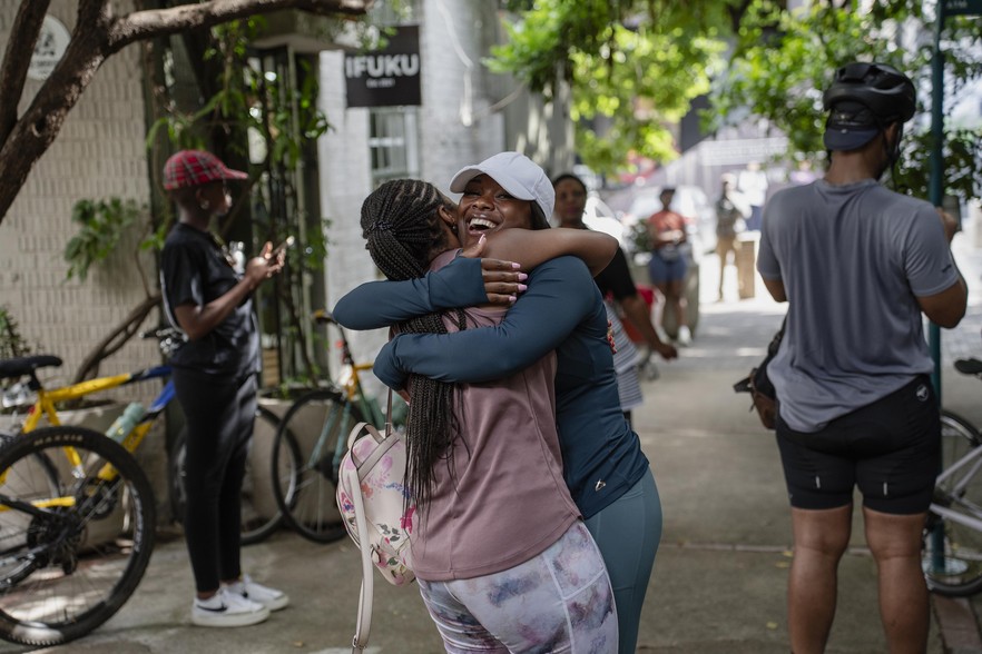 Friends enjoy a hug before the start of the ride. The social aspect plays a big role in bringing the women together for the ride.