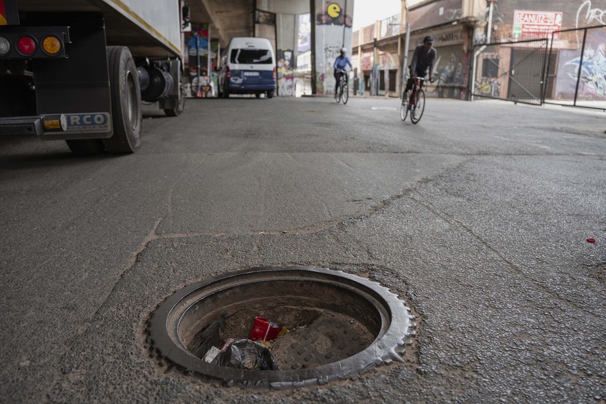 An uncovered manhole poses a risk to riders.