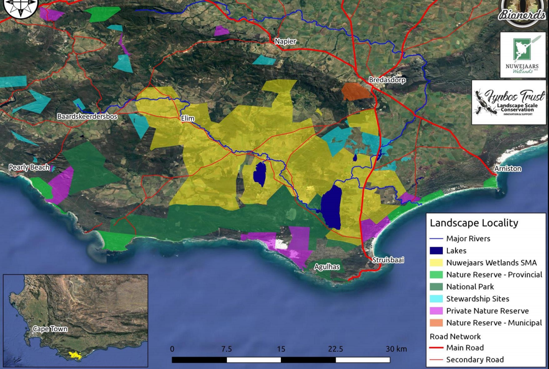 • In 2008, 26 landowners on the Agulhas Plain established the Nuwejaars Wetlands Special Management Area to manage and restore 47,000 hectares of their biodiversity-rich properties at the southern tip of Africa.