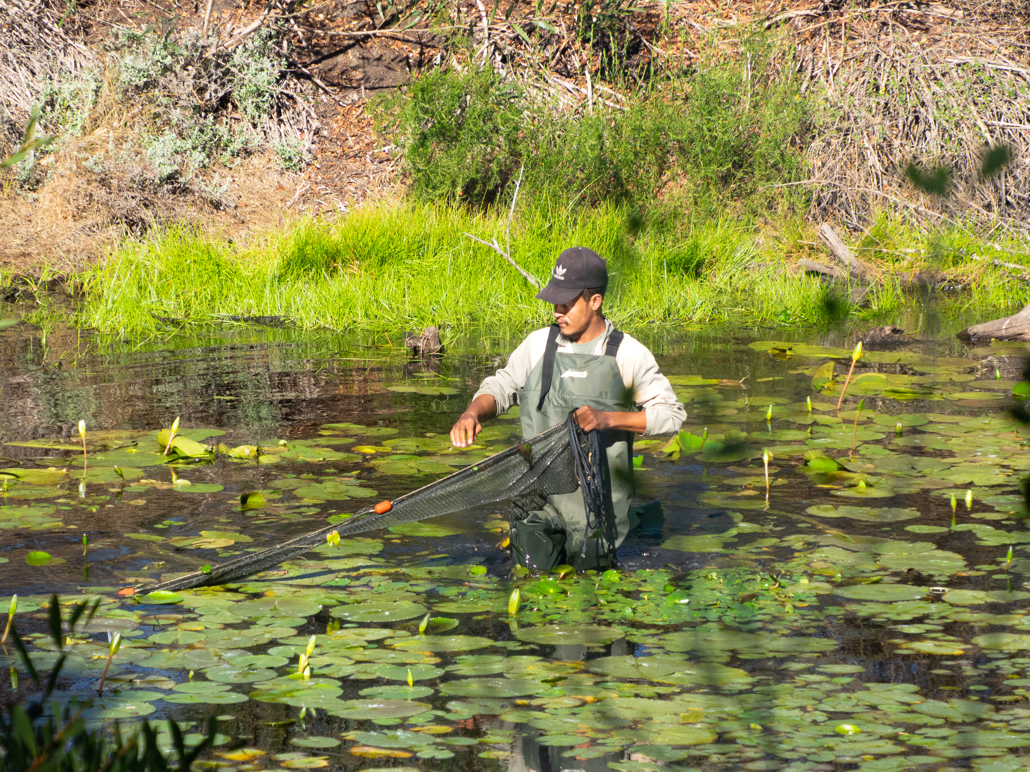Environmental monitor Breyton Murtz conducts indigenous fish sampling in the Nuwejaars wetlands, where an endangered endemic fynbos species – the Agulhas redifin – was scientifically described this year. Photo supplied by the NWSMA.