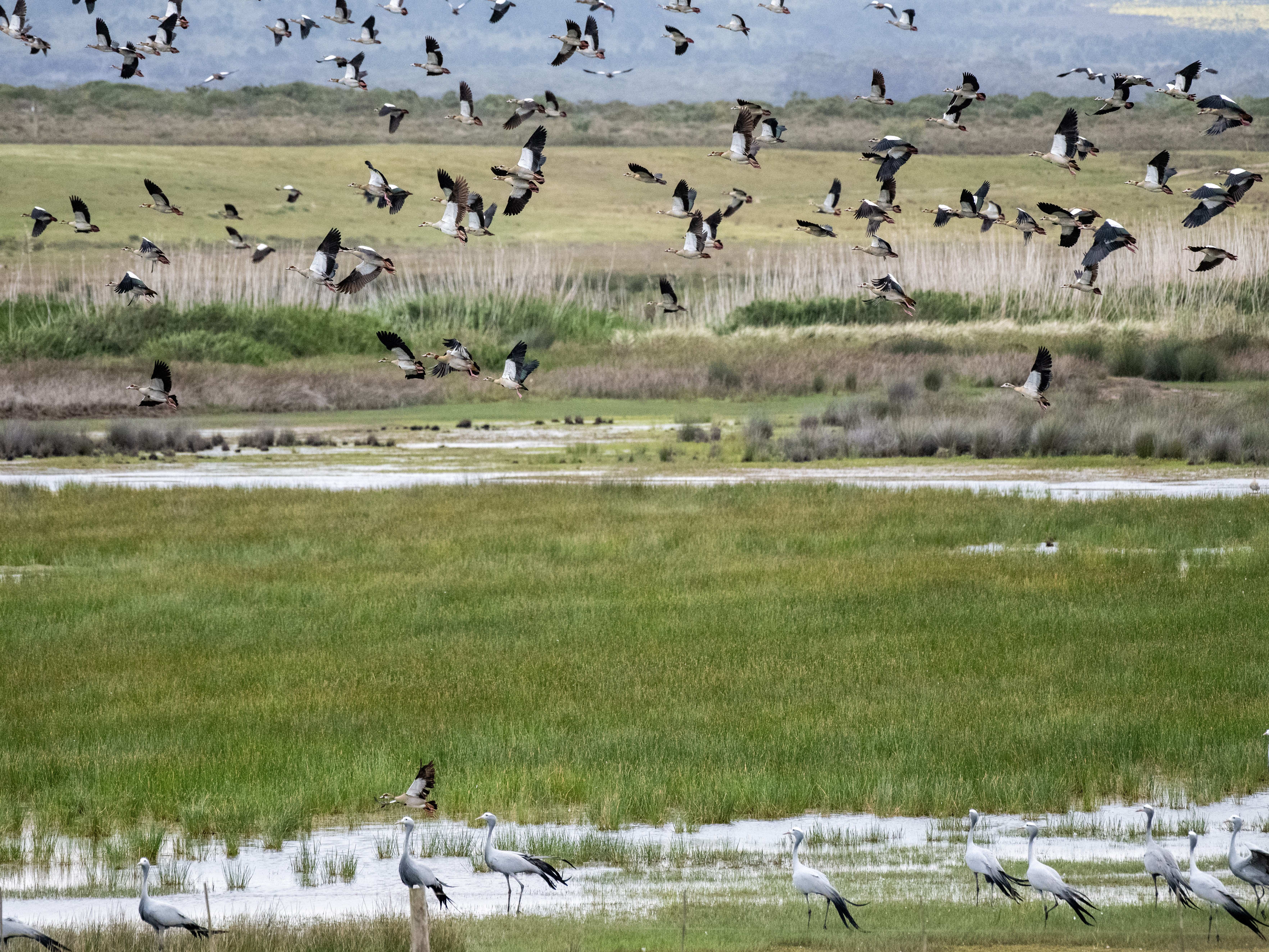 A huge flock of Egyptian Geese takes off from a wetland area of the Nuwejaars River on the Agulhas Plain, watched by Blue Cranes. Extensive clearing of invasive alien plants by the Nuwejaars Wetlands Special Management Area has restored significant bird habitat. Photo: John Yeld
