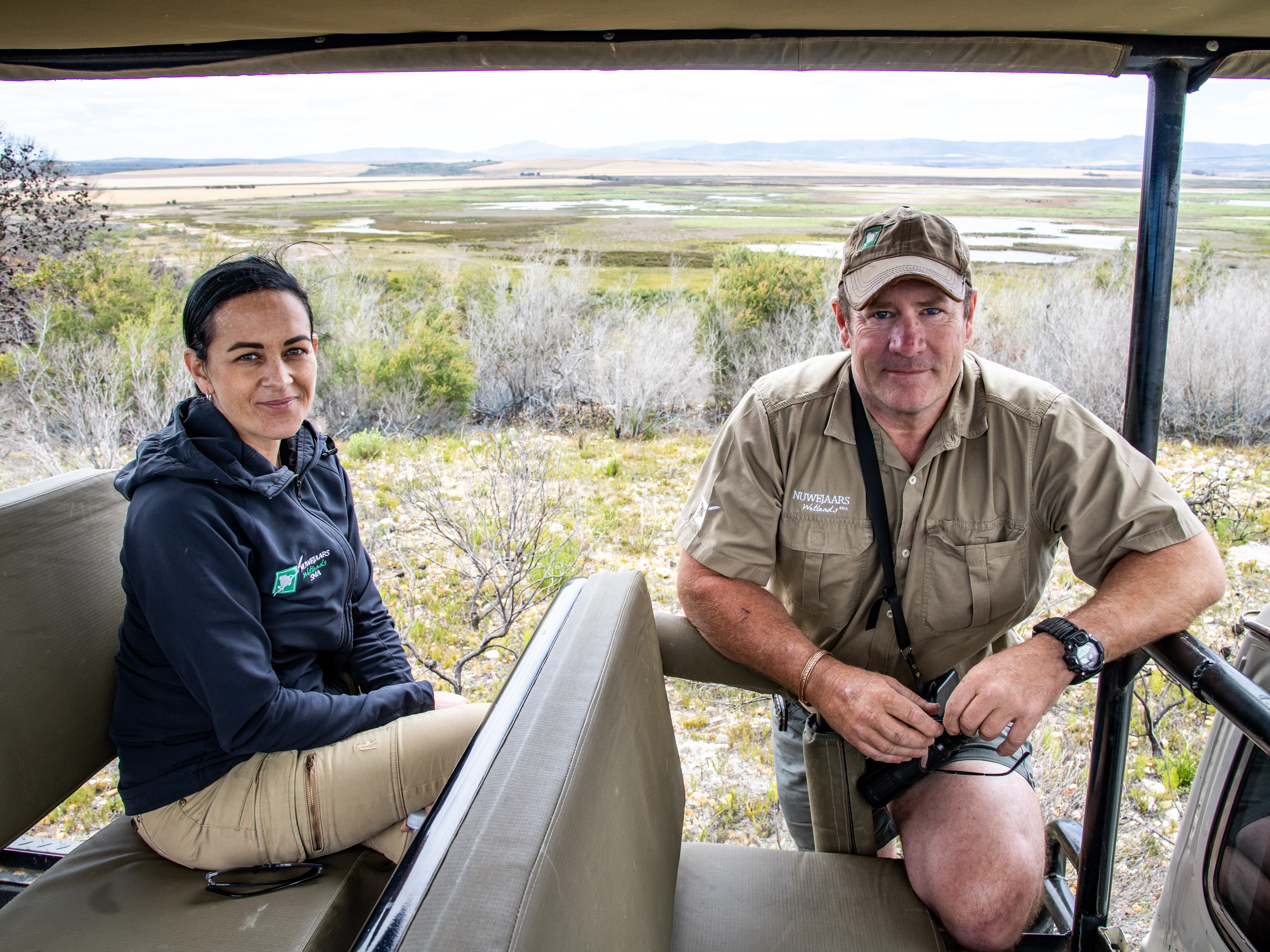 Nuwejaars Wetlands Special Management Area conservation manager Erica Brink and operations manager Ross Kettles. In the background is part of the wetlands where hippos were reintroduced after being shot out more than 150 years ago. Photo: John Yeld