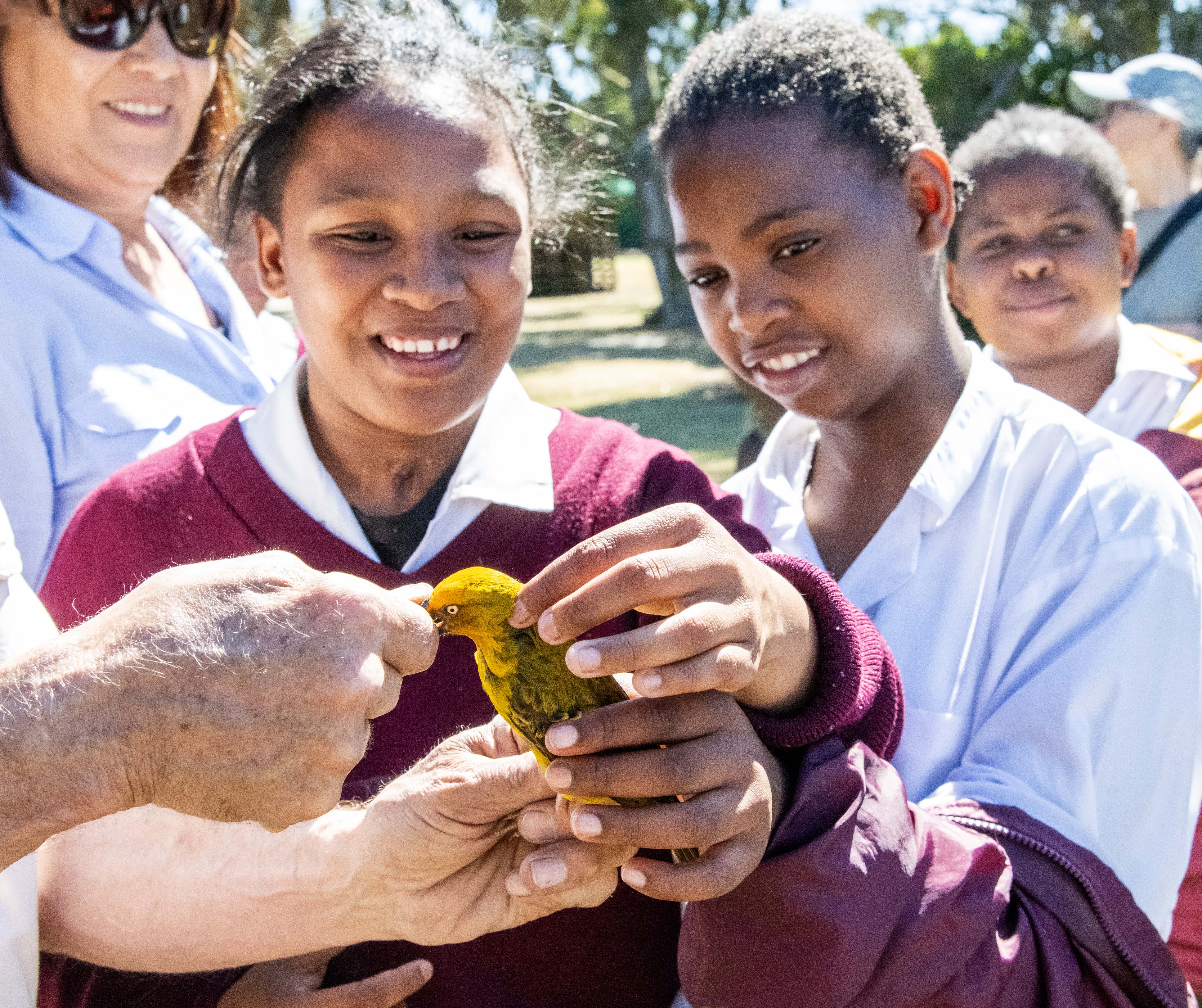Mary-Jane Julies (left) and Mihle Sigeney from the Mispah School for Learners with Special Educational Needs in Elim village hold a Cape Weaver during a bird ringing demonstration by the Biodiversity and Development Institute. This is part of an environmental education week organised by the Nuwejaars Wetlands Special Management Area. Photo: John Yeld