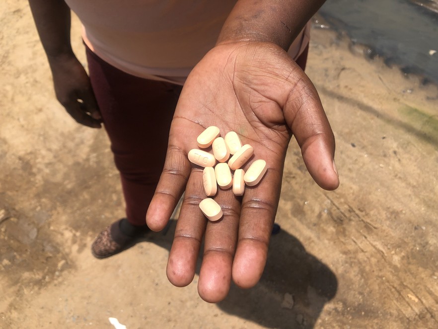 A woman with HIV holds the few antiretroviral pills she has left. She says she has been blocked from obtaining more medicines from the clinic she uses by members of Operation Dudula. The organisation’s leader appears to deny the allegation. Photos: Kimberly Mutandiro