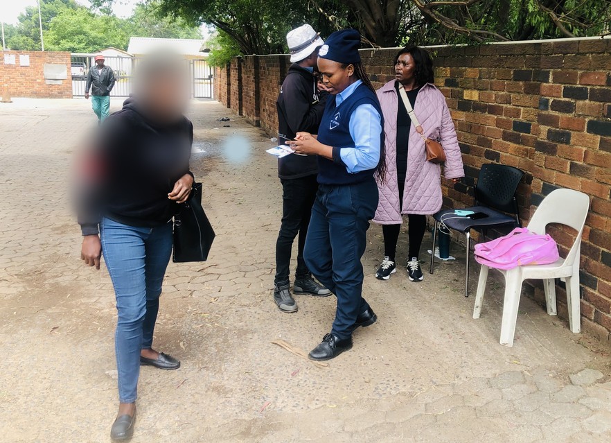 A security guard checks Kudzai’s ID. Behind the security guard is another security guard and a woman who a clinic staff member said was with Operation Dudula.