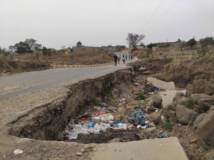 A vehicle bridge, known as C Bridge, connecting two parts of the township over the Goqo River, partly collapsed in February 2025 after heavy flooding. Since then, a large crater has formed along the part of the collapsed bridge. The hole has now become an illegal dumping site and is full of rubbish.