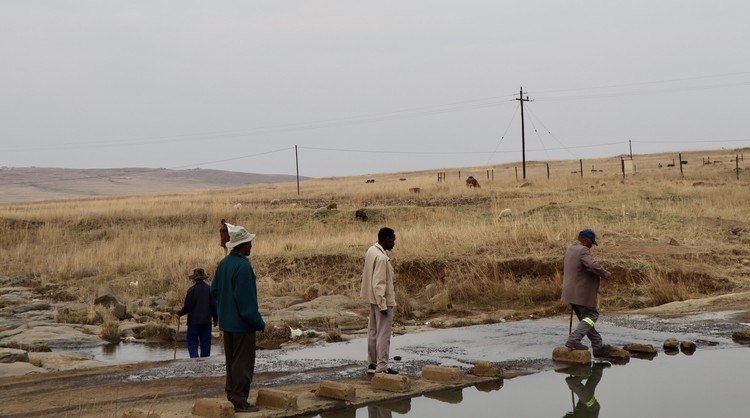 Elderly men in East Nquthu use concrete blocks to dodge the water that has flooded a bridge. Photo: Joseph Bracken