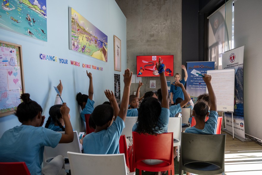 Little Optimist facilitator Erica McCune teaches a school group from Heideveld about water safety, ocean ecology and sailing skills.