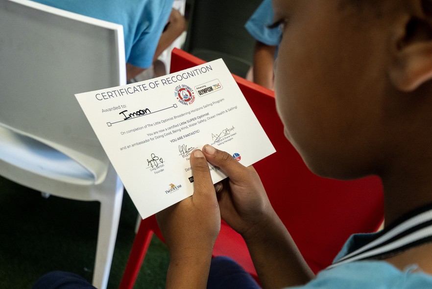 A school group receives prizes after completing the Broadening Horizons Sailing Program at The Little Optimist Trust sailing academy in the Waterfront.