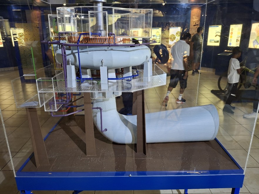 The visitors centre at the Drakensberg Pumped Storage Scheme. After the Thukela-Vaal Transfer Scheme was approved, engineers recognised the potential for a hydroelectric power station to be situated between the upper and lower reservoir. The then Department of Water Affairs and Eskom started work on this dual-purpose scheme in 1974, completing it in 1982. Electricity is generated only during peak demand periods or emergencies by channelling water from the upper to the lower reservoir through reversible pump-turbine sets. During periods of low energy demand this same water is pumped back from the lower to the upper storage reservoir.