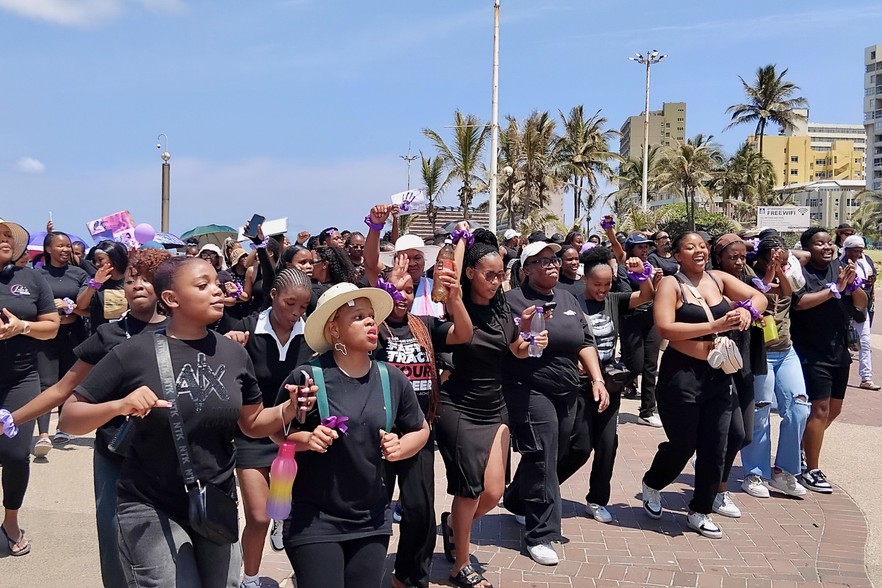 Hundreds of women, mostly dressed in black and purple gathered at south beach in Durban chanting “Wathinta bafazi wathinta imbokodo” (You strike the women you strike a rock). Photo: Tsoanelo Sefoloko