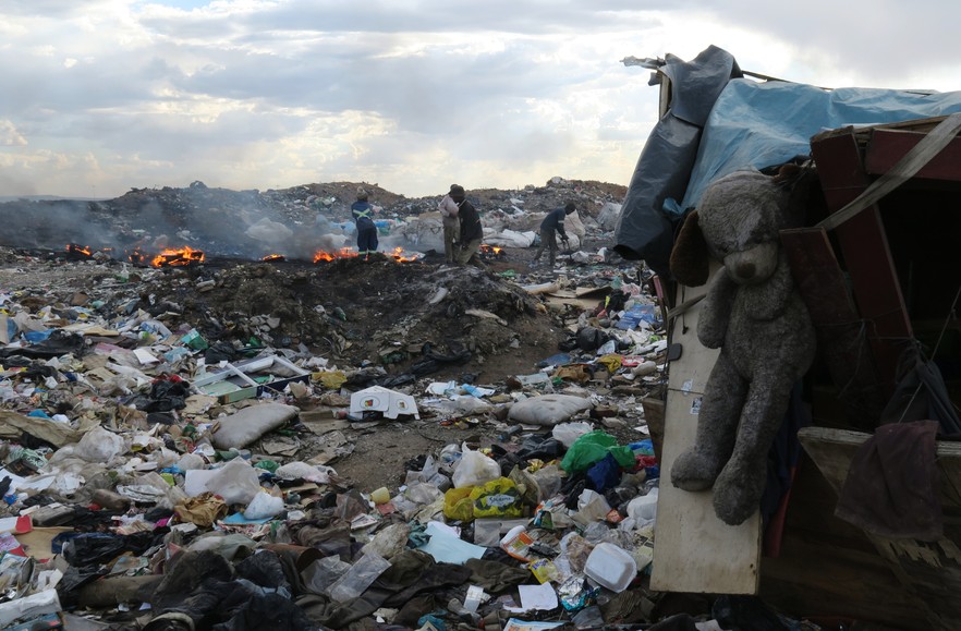 Scores of waste pickers were on the site in search of recyclable materials. Noxious plumes of thick, black smoke rose from several fires where waste pickers burned off rubber and plastic encasing any metal that can be sold for recycling. This included old tyres. Meanwhile, old fires continue to smoulder within the mountain of waste.