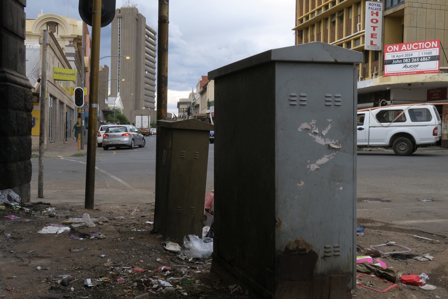 Litter and potholes are characteristic of downtown Kimberley, while vacant plots and the veld around the town is an extended illegal dump.