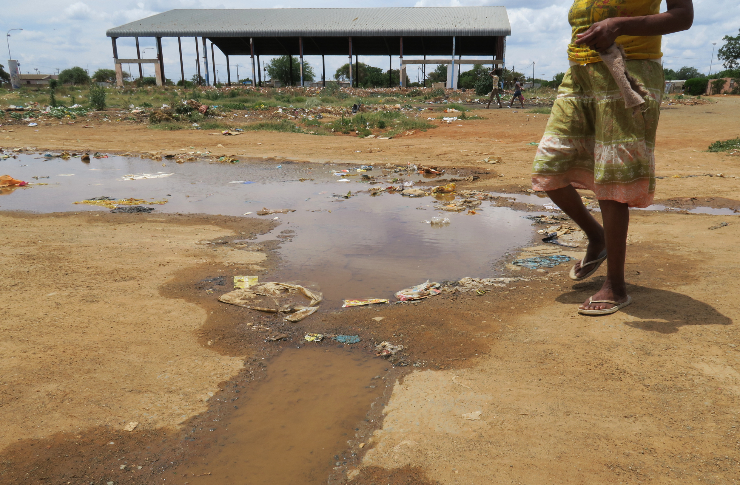 A water leak in Jupiter Street in the suburb of Roodepan, Kimberley. In the background is the remnant of a community hall which was stripped by thieves during the covid lockdowns and never repaired. A resident said the hall once had a kitchen and was a popular centre for weddings, anniversaries and other special occasions. A community hall in neighbouring Galeshewe was also stripped.