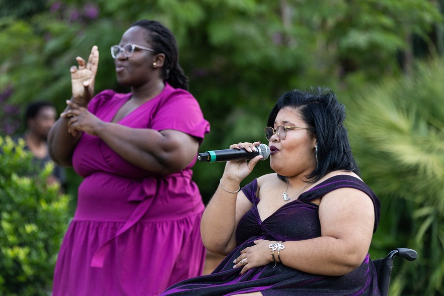 Nikita Scott performs a song with a sign language interpreter, Unathi Kave.