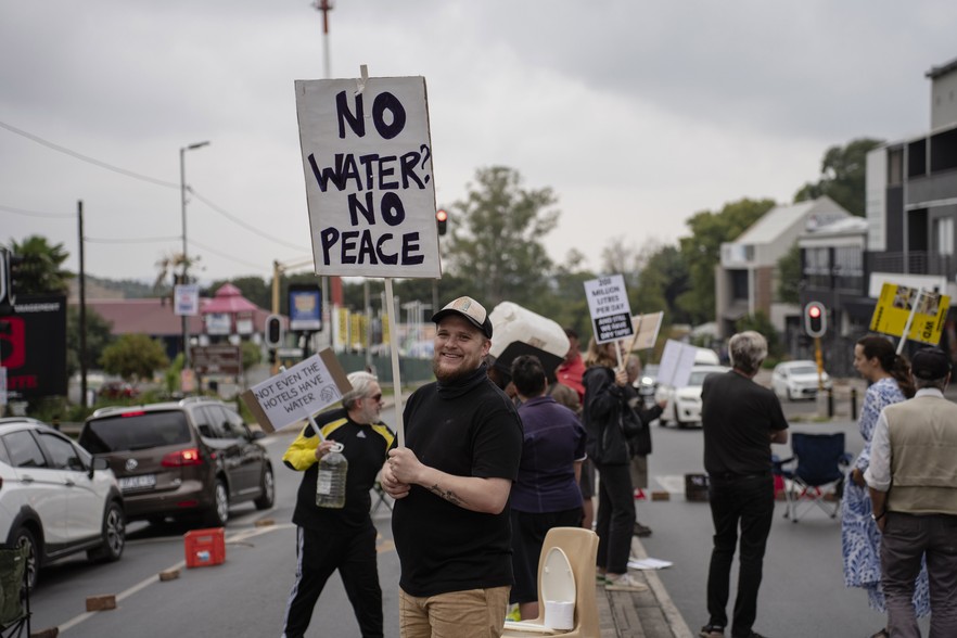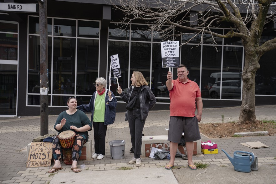 Carl Spies, who works at the nearby university, said students have complained about the lack of water. Spies waved a placard reading, “Even hotels don’t have water,” in reference to Gauteng Premier Panyaza Lesufi telling residents that he booked into a hotel to bathe when he has no water.
