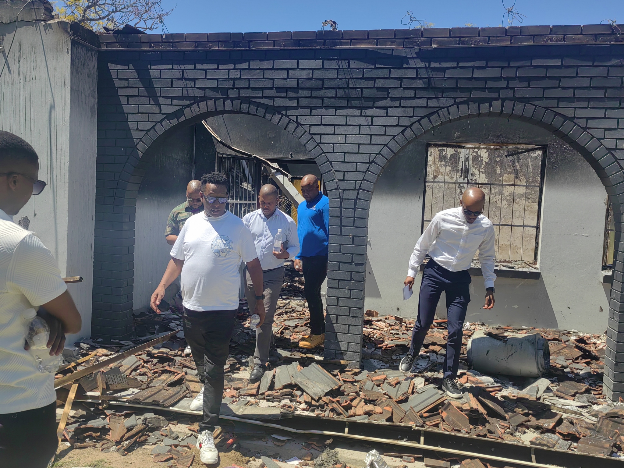 Chair of Parliament’s higher education portfolio committee Tebogo Letsie and other MPs walk through the rubble of the destroyed wellness centre at Fort Hare University on Tuesday. Photo: Johnnie Isaac