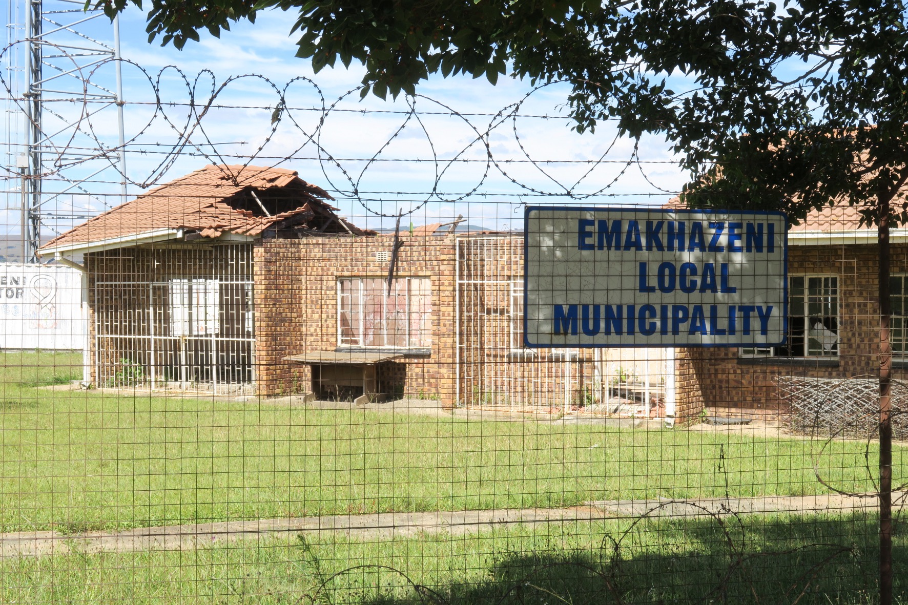 The local municipal office in Emthonjeni township, Entokozweni, was burned down during a protest in 2022, according to a security guard at the site. It has not been repaired and no services are offered at the building.