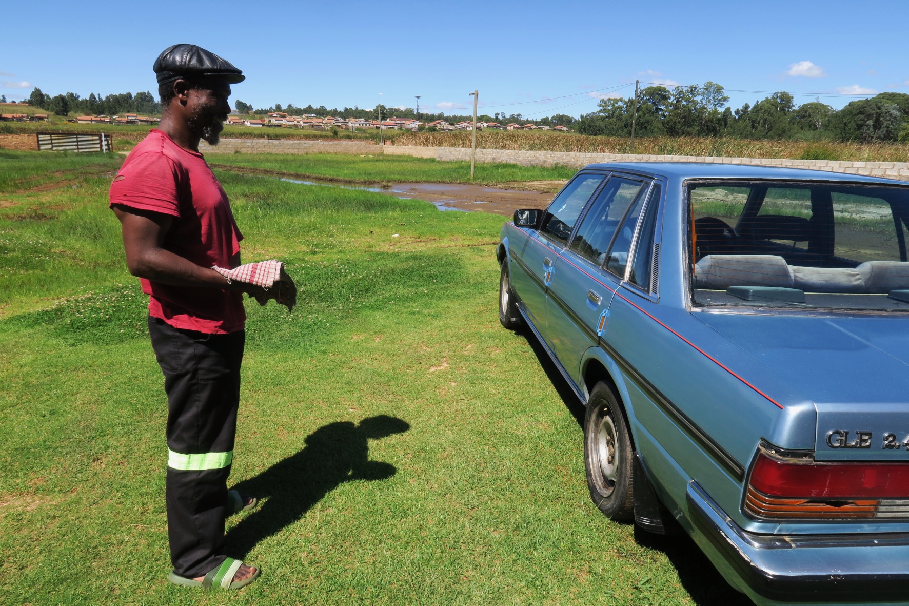 Truck driver Dennis Dladla cleans his classic Toyota Cressida in the yard of the house where he rents a room. In order to get to the house, he has to drive through a pool of raw sewage in the yard, which can be seen in the background. He and other tenants have laid steppingstones around the yard to get to the street. He says the municipality occasionally sends a honeysucker to drain the sewage, but that only lowers its level, and it floods back in from an adjacent vlei within a day. The sewage stems from major leaks in the sewers upstream of the vlei.