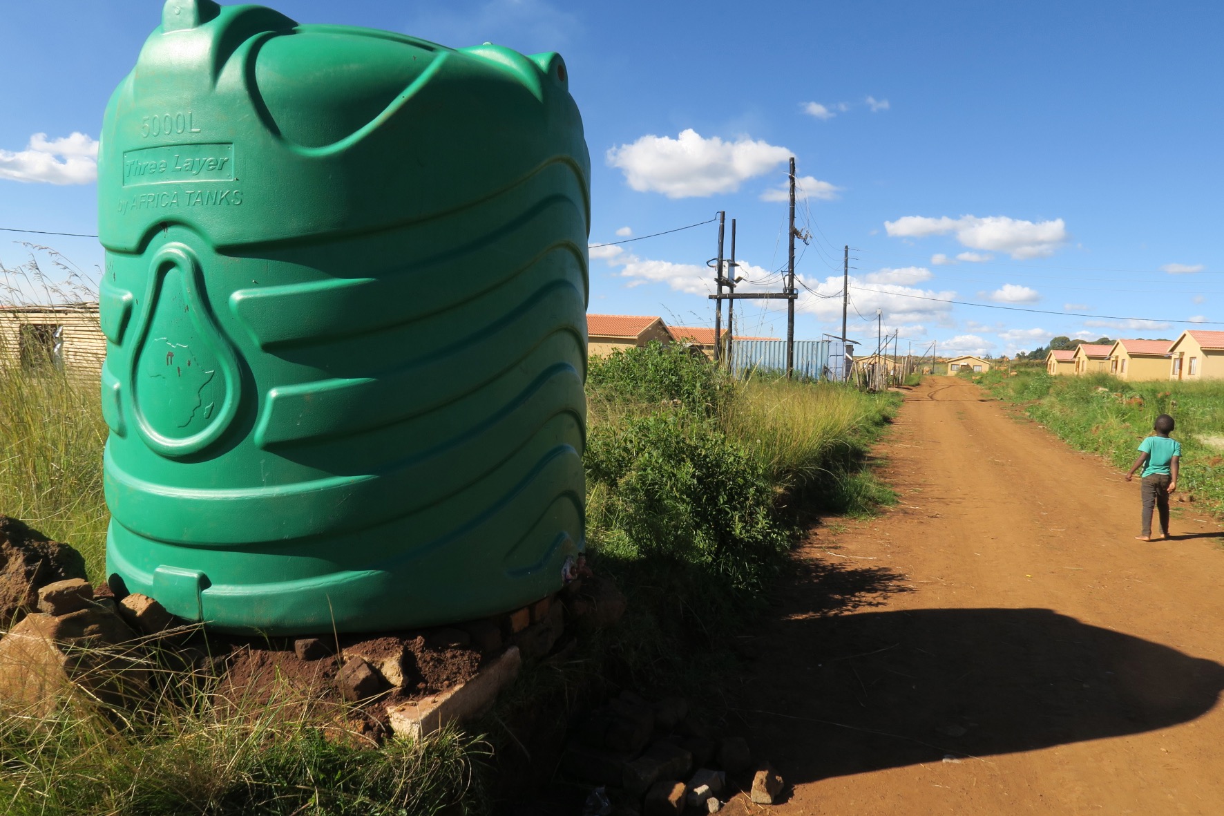 We observed a similar situation at the housing project in Gugulethu in Emgwenya, where houses also rely on water tanks and have uneven dirt roads.