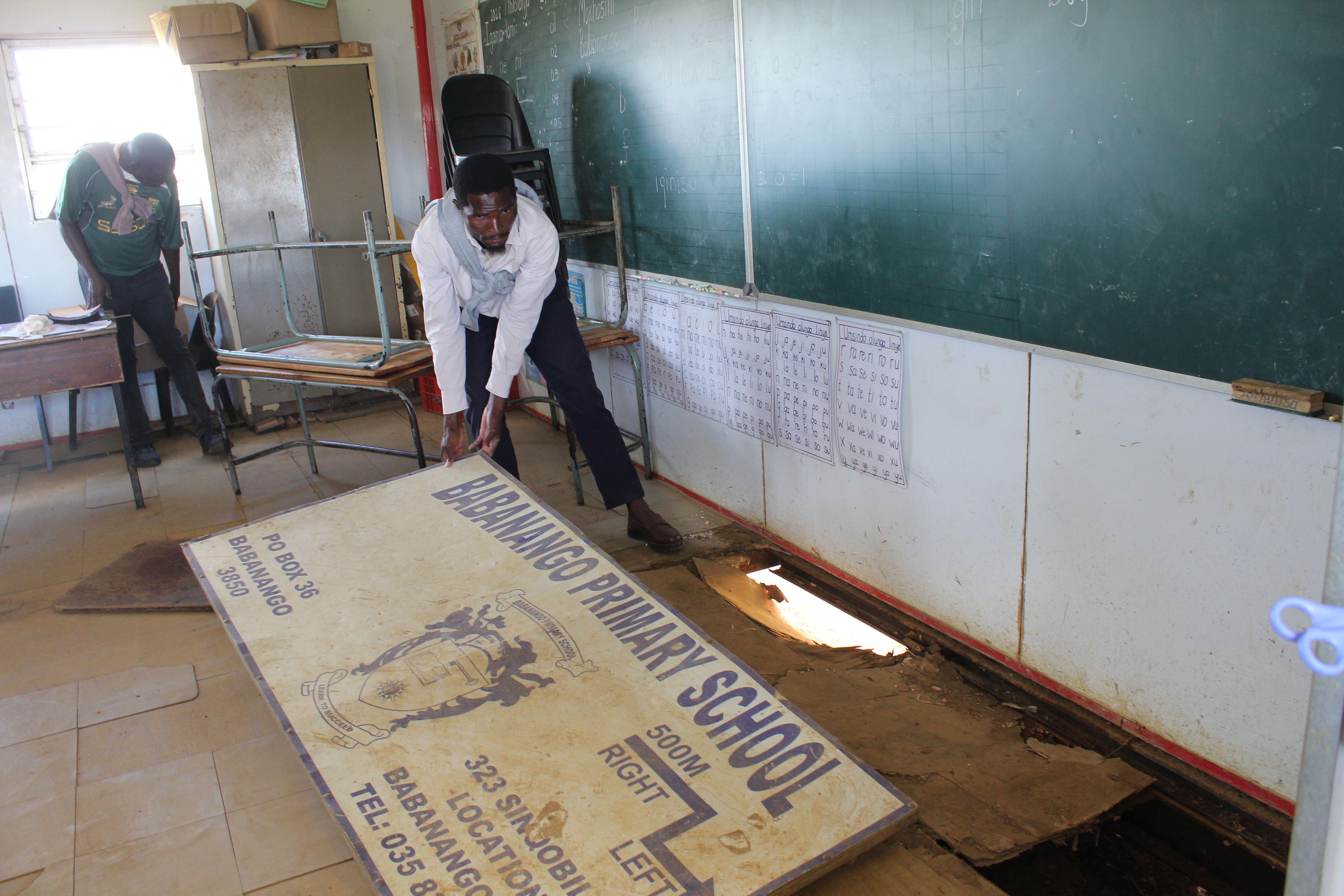 Community Forum member Bongani Mthanti lifts up the school’s signage board which is used to cover holes in the floor of one of the prefabricated classrooms at Babanango Primary School in rural KwaZulu-Natal. Photos: Bongane Motaung