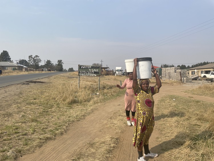 Residents in Nquthu walk past a “water 4 sale” sign carrying buckets of water.