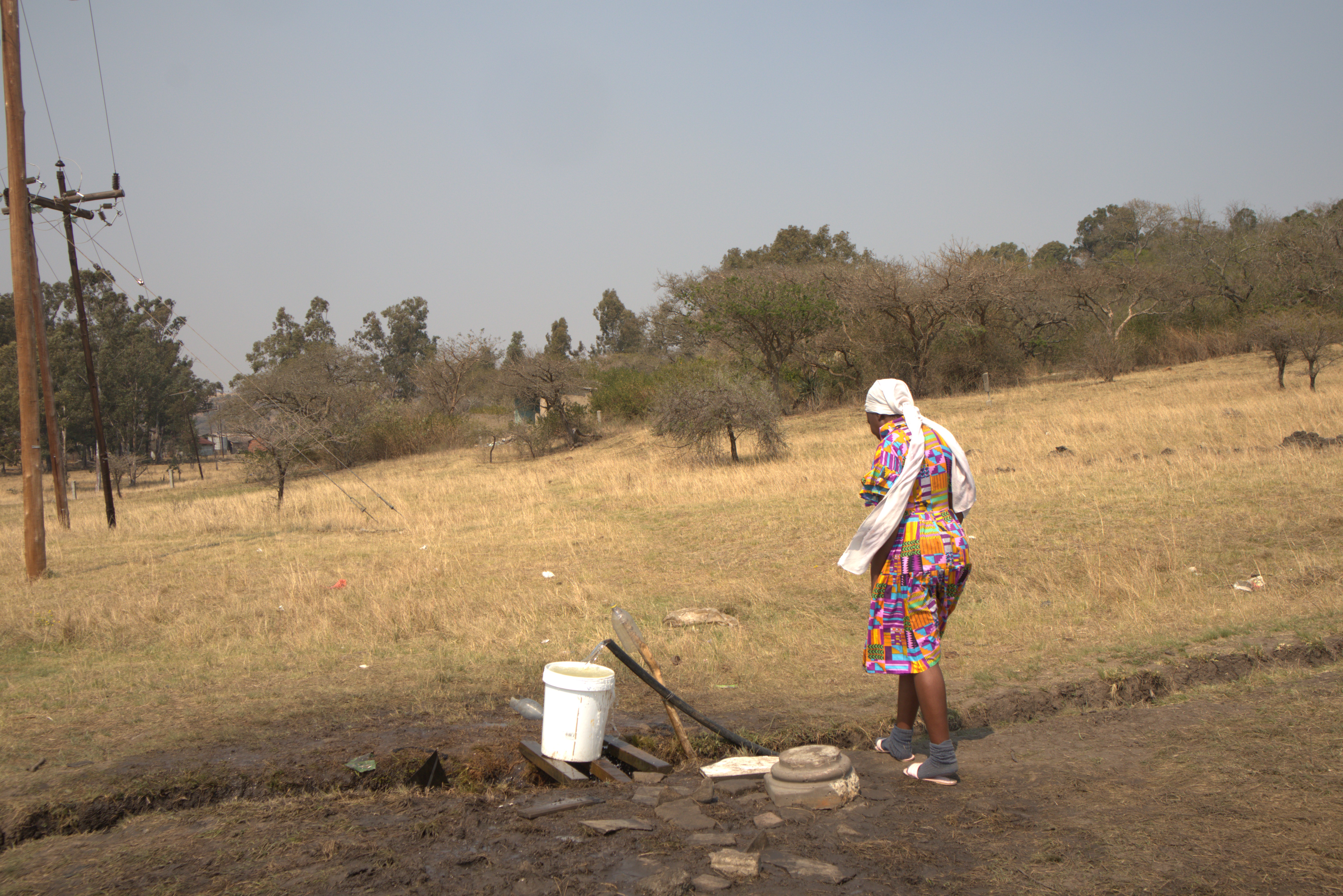 On the border of Sibongile township are the Dundee July horse racing fields, next to which is a communal water area with twelve taps. Only four are still connected to water, although the faucets are broken and there has been no water supply for several months. Young boys showed us how they had chipped away at a pipe to access some trickling water.