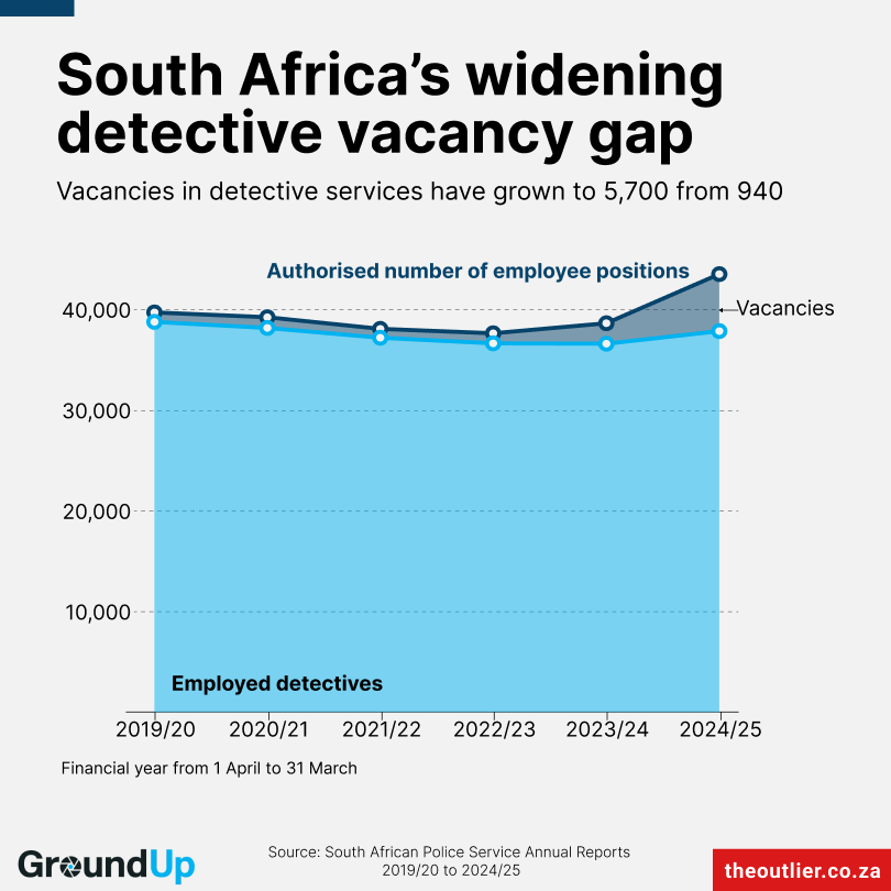 The number of budgeted detective posts in 2019/20 was just shy of 40,000. Just under 39,000 of these posts were filled, leaving a gap of about 940 unfilled posts. By 2024/25 the number of posts had grown to over 43,500 but the number of detectives had dropped to under 38,000 — a shortfall of about 5,700.