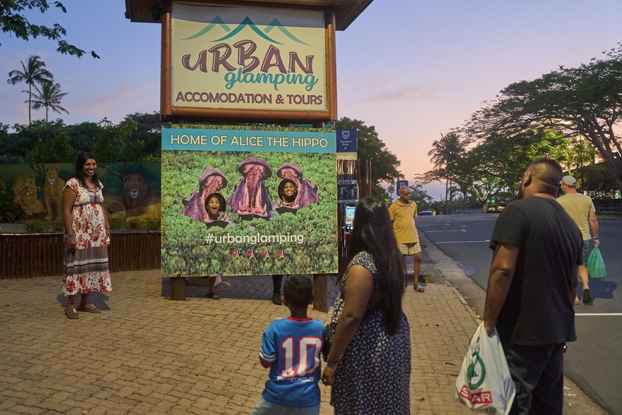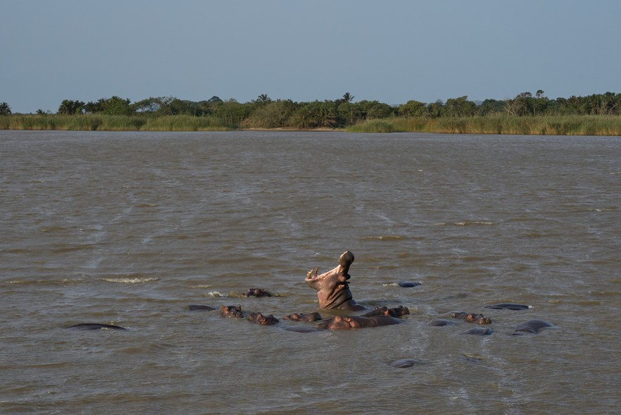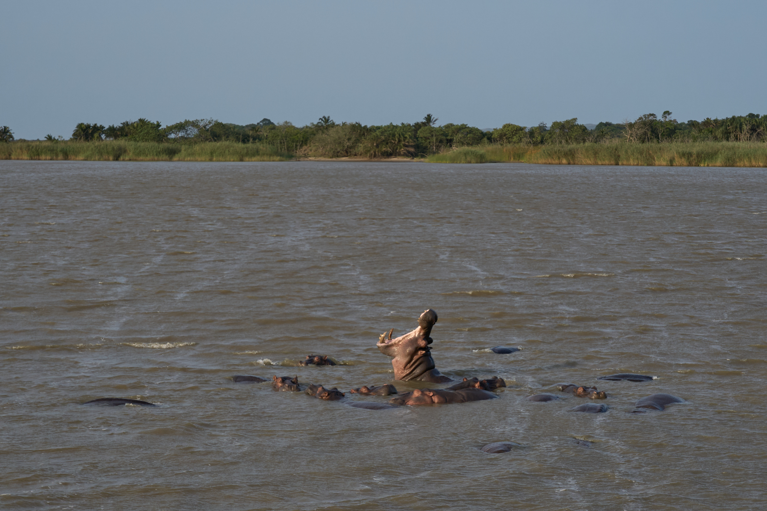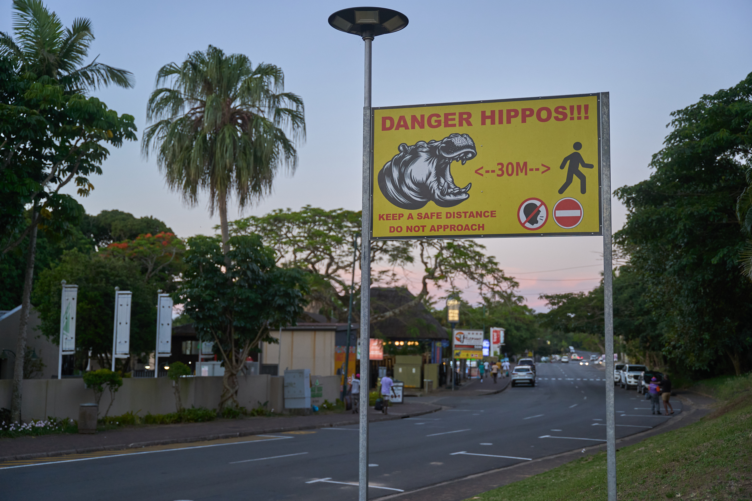 Mackenzie Street, St Lucia’s 500m long main road, is saturated with hippo-related signage. Some signs advertise daily hippo viewing boat cruises. Others warn visitors of the dangers of hippos. Those closest to the town leave the estuary at night to graze on grass in and around the town.
