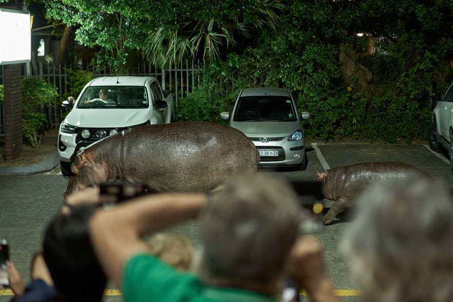 Despite the amount of interaction between humans and hippos in St Lucia, few serious incidents have been reported. The hippos take fairly predictable routes when they wander into town. Private security patrollers monitor them from their vehicles, keeping a safe distance. People who watch from hotels or restaurants are able to get an even closer view of the animals than they do from the cruises, much to their delight.