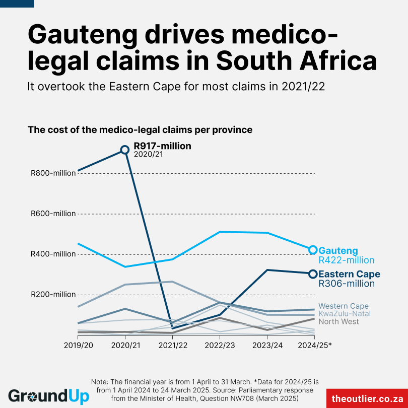 Claims against the state for medical negligence were about R62-billion, more than 20% of the public health budget, as of March 2024. But ultimately only a fraction of claims get paid, because many claims are settled for lower amounts and many have no realistic chance of success.