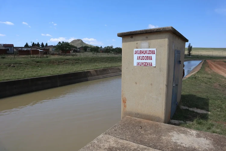 “Swimming and fishing prohibited”, a sign alongside the Tugela-Vaal canal warns. The canal transfers water from Woodstock Dam and Driel Barrage to the Drakensberg Pump.