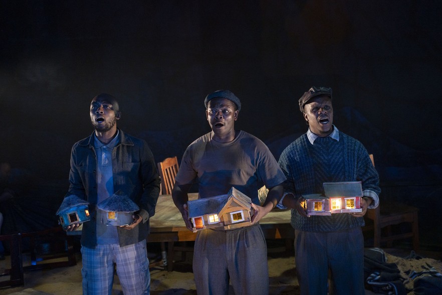 The cast sing while holding model homes to represent the village households and the risks the mine poses to them.