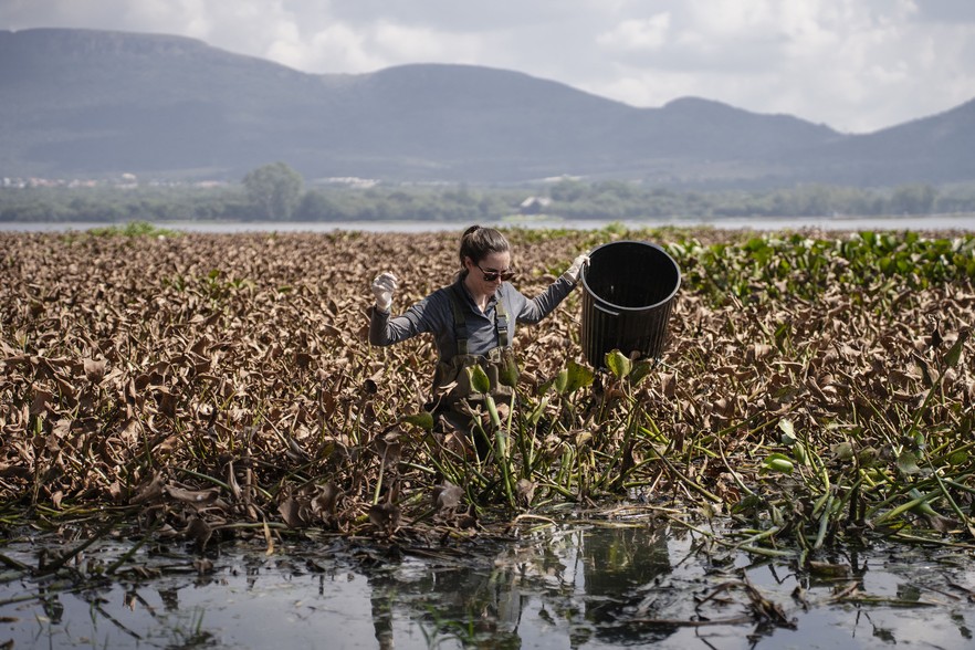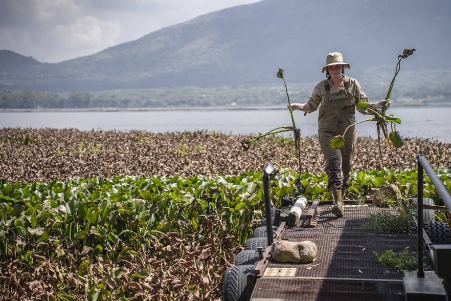 Emma Sandenbergh, a researcher with the Centre for Biological Control (CBC), removes water hyacinth damaged by plant hoppers at Hartbeespoort Dam.