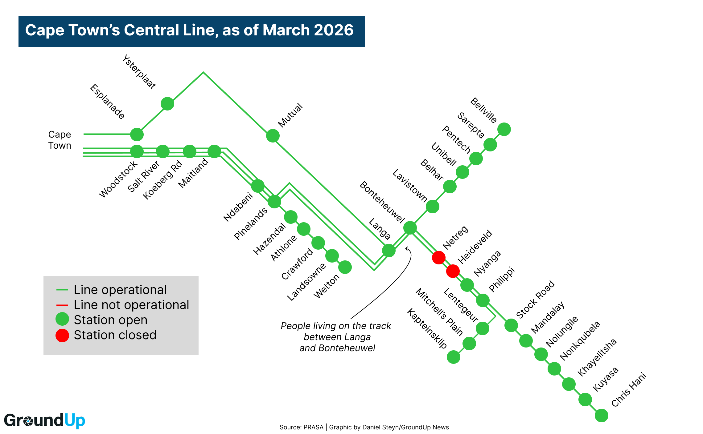 Between Langa and Bonteheuwel stations, more than 1,250 families are still living along the line, having built shacks there during the covid pandemic. The settlement does not appear to be disrupting the train services.