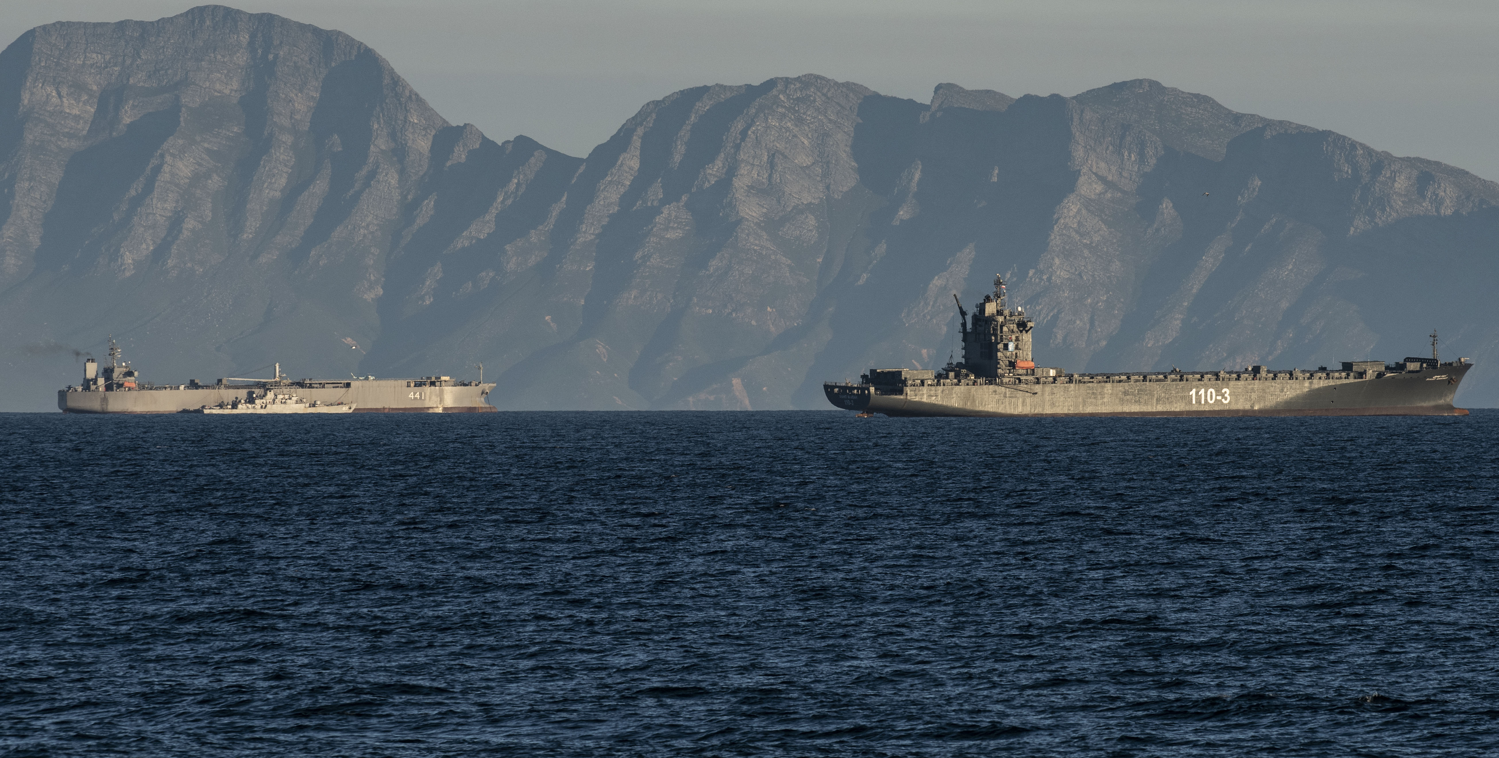 A man walks on the beach while three Iranian naval ships – the IRIS Makran, a corvette named Naghdi, and the IRIS Shahid Mahdavi – cruise in False Bay on the morning of 13 January. Photos: Brenton Geach